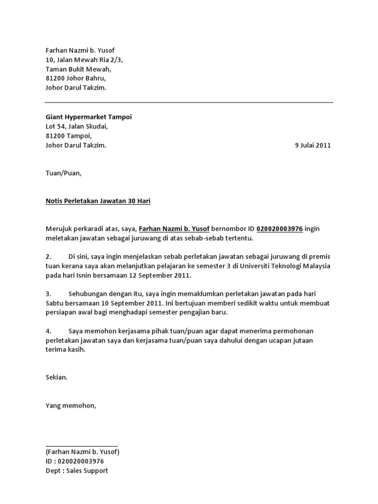 Contoh surat berhenti kerja (notis 24 jam & sebulan) dalam bm & bi. Khas untuk mereka yang nak berhenti kerja tapi masih pening nak buat surat rasmi notis berhenti kerja tu. Contoh surat berhenti kerja notis sebulan masuk lebih dubai burj khalifas. Notis berhenti kerja saya adalah 1 bulan. Xyz sdn bhd lot plo 88 jalan ubi kayu 81400 senai johor darul takzim. Biodata perdana menteri malaysia 7 borang a kwsp pdf borang be 2018 download borang cuti kuarantin 2018 biodata perdana menteri malaysia pertama hingga sekarang borang cuti tanpa gaji guru borang cuti rehat khas guru terkini biro tatanegara jabatan perdana menteri biodata umar bin al khattab borang. For more information and source, see on this link : Tapi saya dah berhenti dgn memberikan notis berhenti kerja 24jam atas masalah peribadi. For more information and source, see on this link : For more information and source, see on this link : Apa yang perlu anda buat adalah muat turun dan edit fail. For more information and source, see on this link : Notis und ähnliche produkte aktuell günstig im preisvergleich.